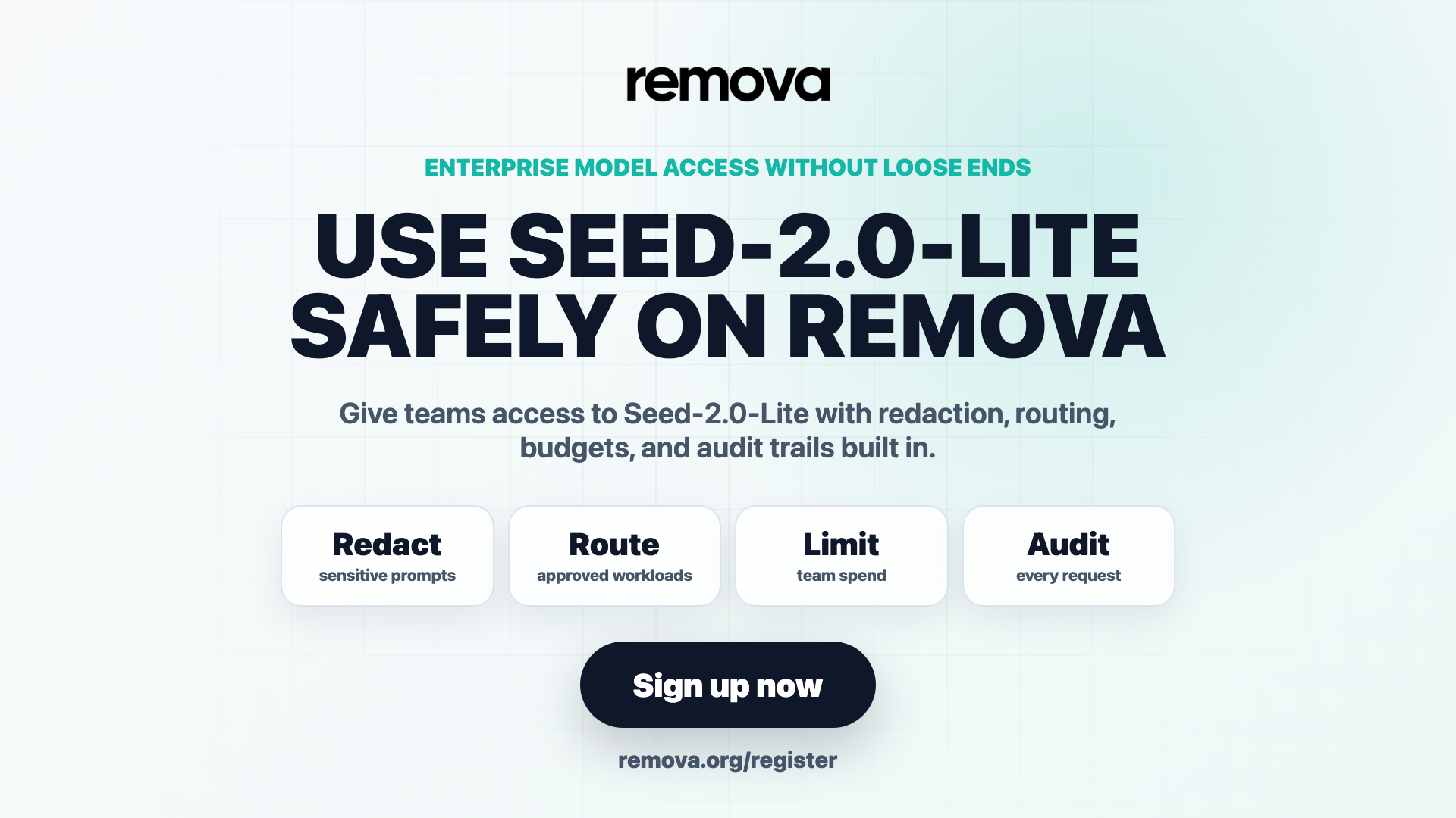Seed-2.0-Lite for enterprise AI. Remova routes model access, long-context analysis, and assistant workflows through governance controls. In the Remova interface, a user selects Seed-2.0-Lite, passes sensitive data redaction, budget threshold, and role access checks, then runs the request safely. Teams can use Seed-2.0-Lite for draft customer communications, analyze spreadsheets, generate product and marketing copy, create presentations, code and debug, summarize long documents. Use Seed-2.0-Lite safely on Remova with redaction, routing, budgets, and audit trails built in. Sign up now.